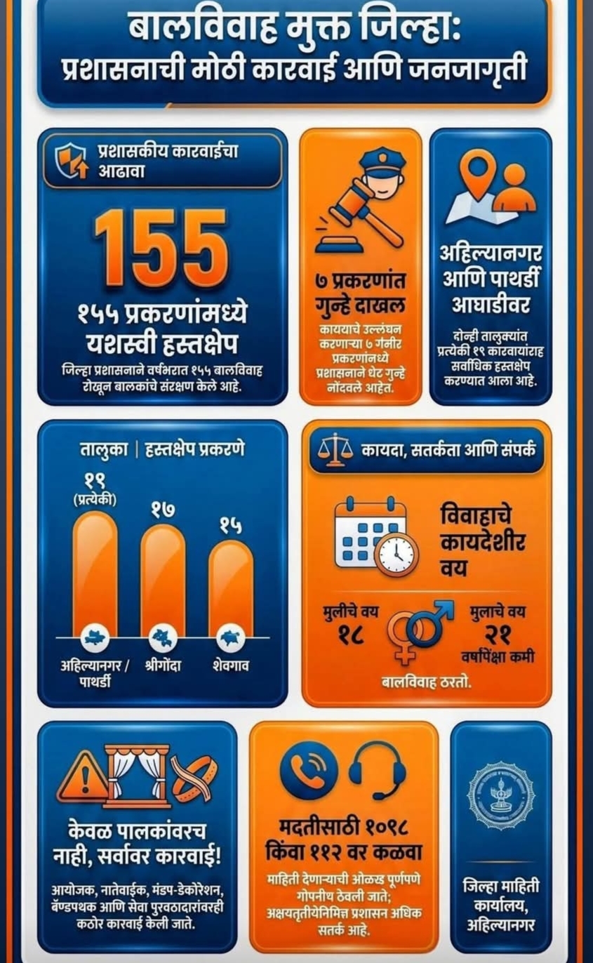 अहिल्यानगर : जिल्ह्यात बालविवाहाच्या घटनांना आळा घालण्यासाठी प्रशासनाने कठोर पावले उचलली असून, प्रभावी हस्तक्षेप, कायदेशीर कारवाई आणि व्यापक जनजागृतीमुळे सकारात्मक परिणाम दिसून येत आहेत. विविध विभागांच्या समन्वयातून राबविण्यात येणाऱ्या मोहिमांमुळे अनेक बालविवाह रोखण्यात प्रशासनाला यश आले आहे.